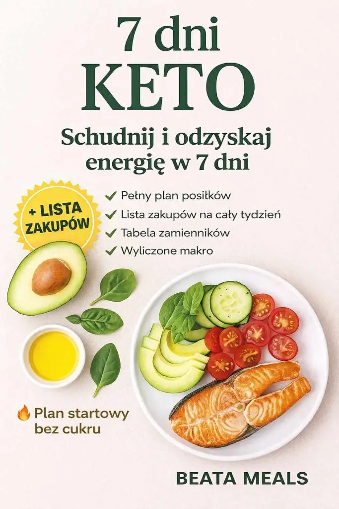 W środku znajdziesz gotowy plan keto na 7 dni, listę zakupów i proste rozwiązania, które pomogą Ci zrobić pierwszy krok.